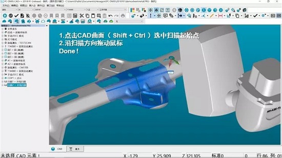 現(xiàn)在,PC-DMIS Laser也支持激光傳感器的快速掃描功能。點(diǎn)擊CAD曲面拖曳鼠標(biāo),即可完成掃描特征的創(chuàng)建。