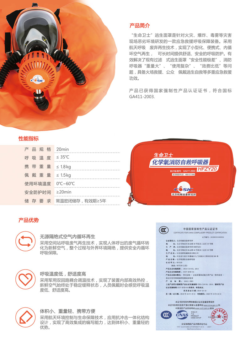 產(chǎn)品采用了航天空氣再生技術、空氣可控緩釋技術、一體化熱控技術,實現(xiàn)了小型化、便攜式、內循環(huán)空氣再生,可長時間提供安全、高效、舒適的呼吸防護,核心指標優(yōu)于國家標準及其他類產(chǎn)品約50%以上。該產(chǎn)品有效解決了現(xiàn)有過濾式逃生面罩“安全性能極差”、消防呼吸器“使用復雜”、“效費比低”等痛點問題,具備消防火場救援、公眾佩戴逃生自救等多重應急救援功效。產(chǎn)品共申請專利12項,具有完全自主的知識產(chǎn)權。