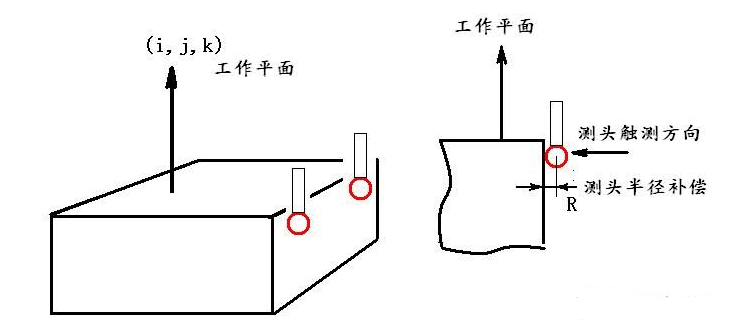 線元素是非常特殊的元素,它的測頭半徑補償存在一個確定補償方向問題。由于我們通常只能測量二維線,所以可以借助於工作平面來確定這個補償方向。因此我們在測頭線元素時,一定要選擇正確的工作平面。這個工作平面要與線的矢量方向,測頭的觸測方向都垂直。用一個直白的例子,如果我們要測量桌子側(cè)面的線,一定要選擇桌子上表面為工作平面。如果這個工作平面選擇錯了,這條線的測頭半徑的補償方向就錯了,位置也就錯了,其直線度也錯了。請記住下面這幅圖。