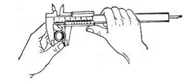 測(cè)量時(shí),右手拿住尺身,大拇指移動(dòng)游標(biāo),左手拿待測(cè)外徑(或內(nèi)徑)的物體,使待測(cè)物位于外測(cè)量爪之間,當(dāng)與量爪緊緊相貼時(shí),即可讀數(shù),如下圖所示: