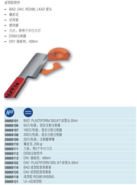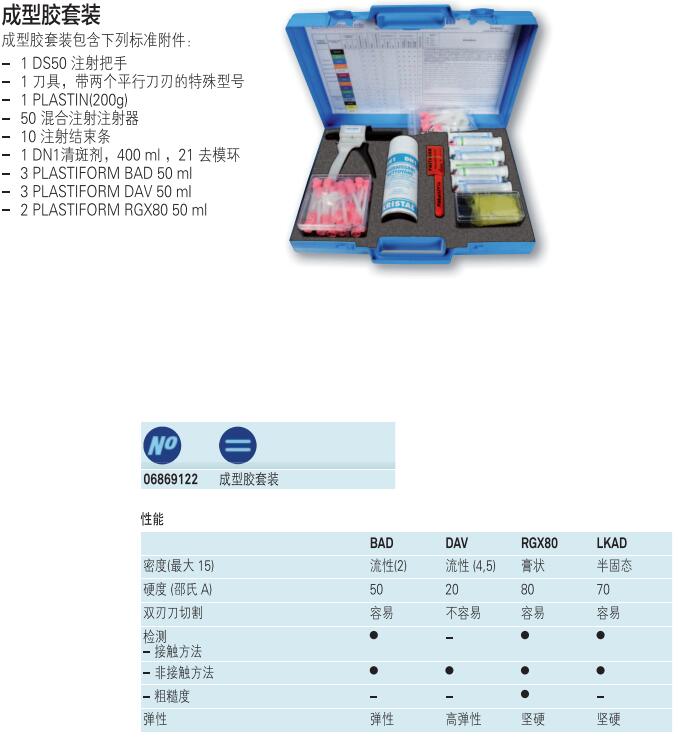 "PLASTIFORM成型膠"產(chǎn)品允許復(fù)制成型復(fù)雜的內(nèi)加工部件,以便使用光學(xué),非接觸測量儀進(jìn)行觀測和檢查。"PLASTIFORM成型膠"包括兩部分組成,它需按相同比例的混合以達(dá)到合適的聚合。需要重新復(fù)制成型的測試部件表面必須非常干凈,表面不得有油類物質(zhì)。