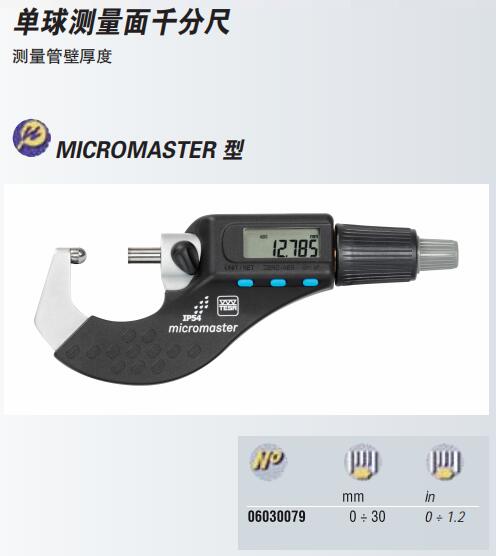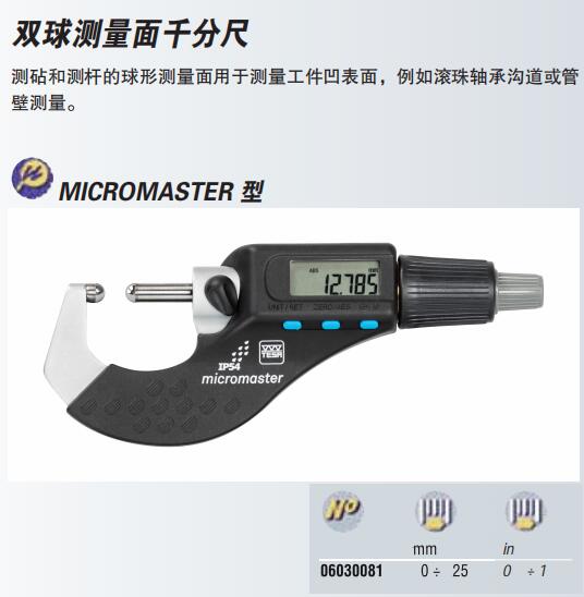 雙球測(cè)量面千分尺,測(cè)砧和測(cè)桿的球型測(cè)量面用于測(cè)量工件凹表面。