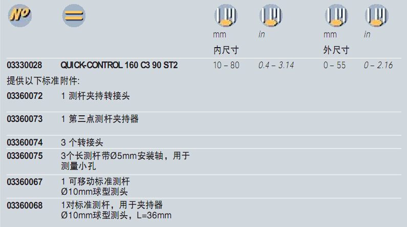 | 03360068 | 1對標(biāo)準(zhǔn)測桿,用于夾持器,直徑10mm球型測頭,L=36mm | | | | | |