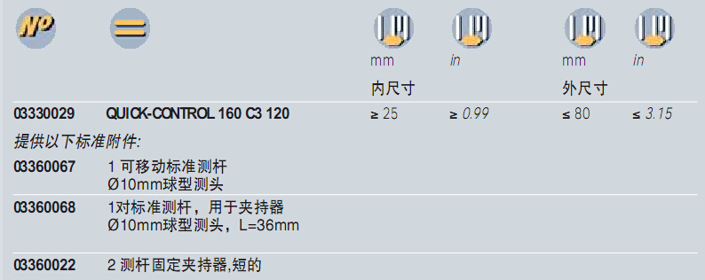 | 03360066 | 3個長測桿帶,直徑8mm安裝軸,直徑6mm直徑的測桿 | 25-120 | 0.99-4.72 | 0-90 | 0-3.54 | |