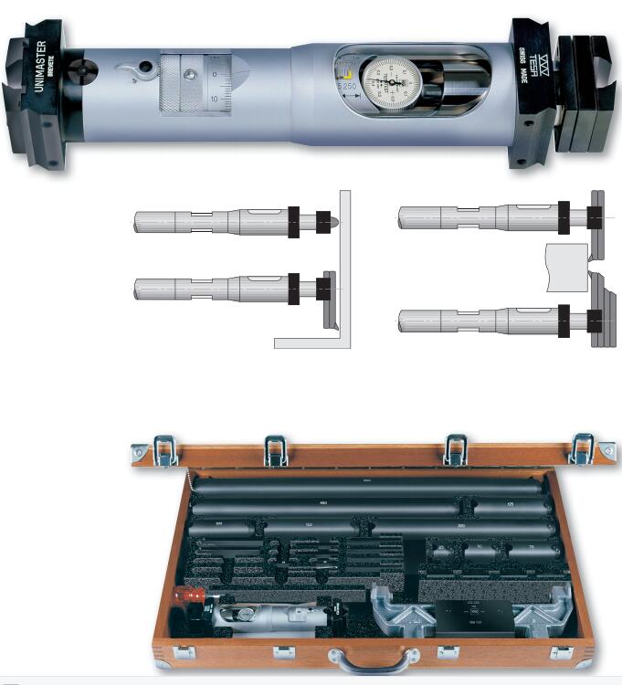 TESA UNIMASTER 與兩點接觸式內(nèi)徑千分尺類似的方式測量工件,本量具配備的內(nèi)置測桿只需要增加必要的加長桿就可完成可擴充應(yīng)用范圍內(nèi)任一尺寸的直接測量。